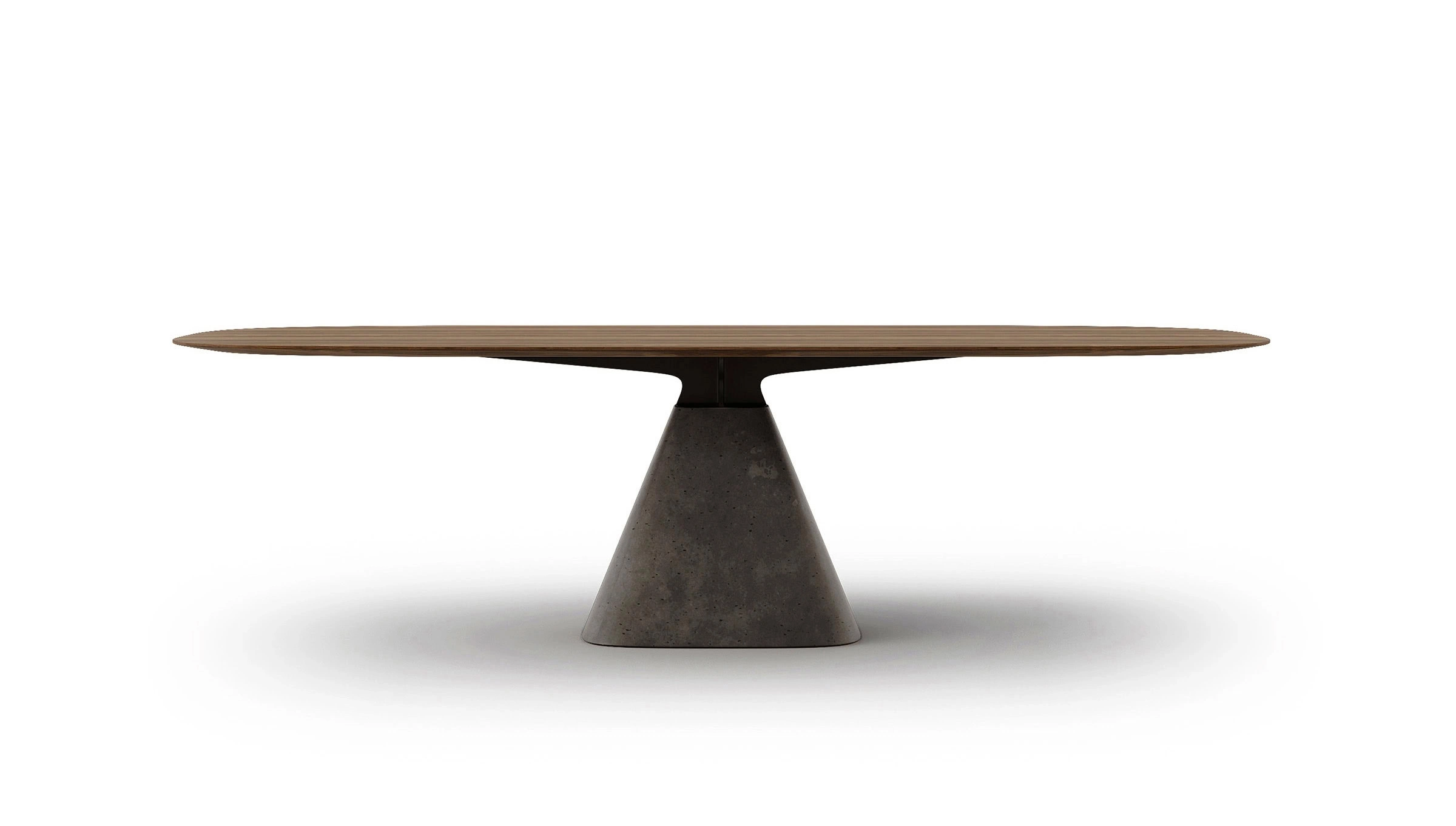 The proportionally finely-tuned base made of a hollow concrete body reflects the shape of the table top. An elegant companion, a true statement, in living spaces as well as at the workplace.